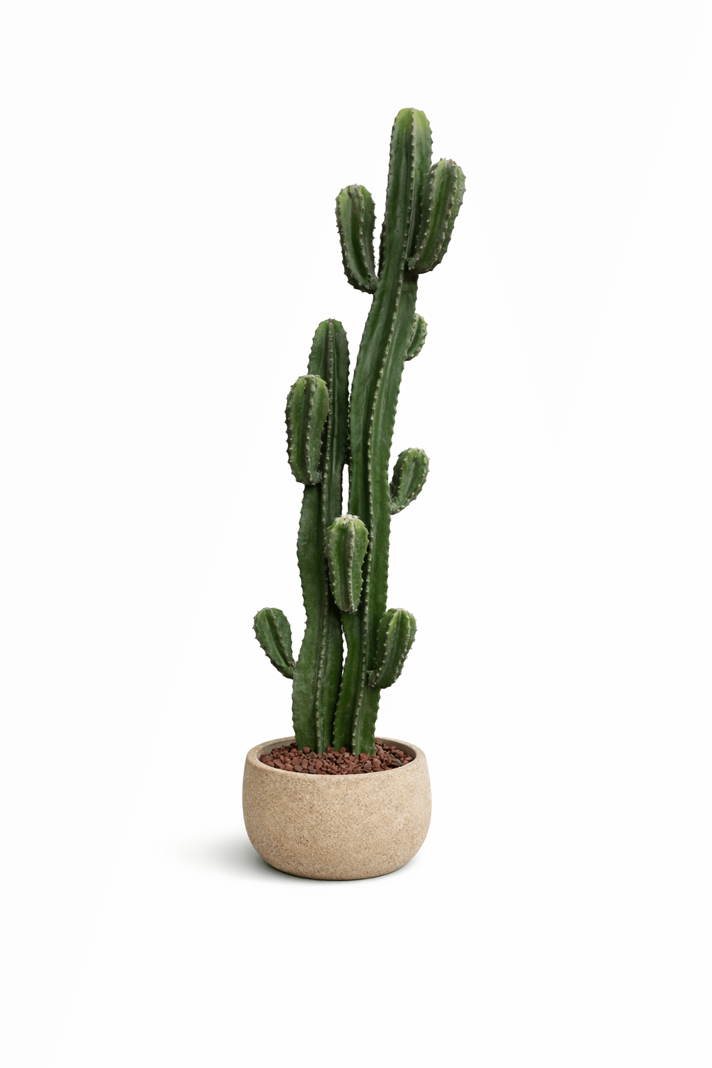 קקטוס סברס במראה טבעי ומרשים, עם עלים שטוחים בגוון ירוק עשיר וטקסטורה אותנטית. מגיע בכלי בטון מעוגל בגימור מינימליסטי שמדגיש את הנוכחות שלו תוספת מדויקת לעיצוב מודרני, נקי וללא תחזוקה